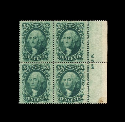 95 ogPB 35 image#35, 10c Green, Ty. V, handsome full right margin partial imprint and plate "No. 2 P." block of four, each stamp within the block being extraordinarily well centered within large margins, sumptuously rich color, o.g., some separated perfs. in sheet selvage, top right stamp with small thin spot, otherwise very fine-extremely fine; a very scarce plate number multiple; ex-Chapin. (Image) as normal block 1,200.00+