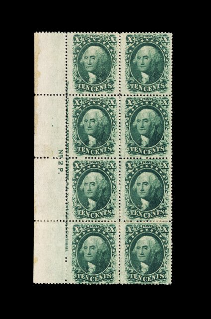 96 ogPB 35 #35, 10c Green, Ty. V, an immensely rare and handsome full left margin imprint and plate "No. 2 P." block of eight, with full imprint placed on the sheet so that it largely falls within the left margin of the stamps in the first vertical row, incredibly well centered, rich luxuriant color, slightly disturbed o.g., some sensible hinge reinforcement of perfs., bottom pair with faint crease, otherwise very fine and choice; in our opinion this plate block rarity is undercataloged in Scott, as only two full plate number blocks are listed in the Chapin census (one part of a much larger multiple), with this example being unrecorded and therefore no more than three such plate blocks are likely to exist: a highly important classic United States plate block; ex-Sheriff, Wampler and Chapin. (Image) 17,500.00
