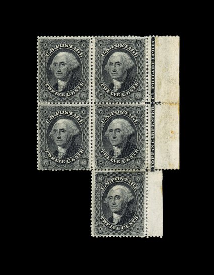 99 ogPB 36b image#36b, 12c Black, plate 3, an extremely rare right margin partial imprint and plate number "3" irregular block of five, the fifth stamp at bottom right having been removed and reattached to fill out imprint, all five stamps are quite well centered, particularly for this notoriously difficult stamp, deep luxuriant color and strong impression, nearly full o.g., top right stamp with small thin spot, overall very fine; a highly important perforated 1857 Twelve Cent imprint and plate number multiple; very few normal blocks of four from plate 3 are even known, and blocks containing either an imprint and/or plate number are almost non-existent, in fact, this multiple and a block of 42 containing a complete imprint and plate number are the only two such recorded multiples; ex-Chapin. (Image) Est. 5,000-7,500