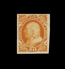104 og 38a image#38a, 30c Orange, imperforate, select unused example of this rarely offered imperforate, without gum as issued, possessing large to huge margins all around, sumptuously rich color on fresh paper, extremely fine gem; one of the largest margined examples we have seen of this, as most are found with much smaller margins, often cutting on one side; 1971 PF certificate; ex-Chapin. (Image) 2,500.00