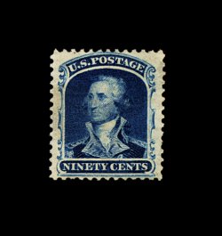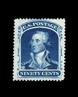105 og 39 image#39, 90c Blue, an extraordinary quality mint example, being exceedingly well centered amid huge margins which are almost unheard of on this value, even its margins at top and bottom which are typically tight are impressively wide on this stamp, gloriously rich color and impression on pristine paper, full clean o.g., lightly hinged, extremely fine gem; a terribly challenging and rare stamp in this outstanding condition; 2002 PF certificate. (Image) 2,900.00