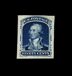 107 og 39a image#39a, 90c Blue, imperforate, exceptionally choice unused copy of this rarity, without gum as always, large to mostly huge margins, deep luxuriant color on fresh paper, extremely fine; seldom offered in any quality, let alone in this premium condition, this being the finest we have encountered; 1976 and 1991 PF certificates; ex-Floyd and Chapin. (Image) 2,750.00