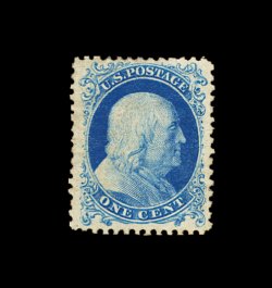 117 og 55 image#55, 1c Indigo "August", full original gum, lightly hinged, exceptionally fresh, with intense characteristic "August" color and impression, quite well centered when compared to all other existing copies (all known examples are centered slightly into the top perforations), but unlike most others, this stamp has fully intact perforations, very fine and exceedingly choice. It is believed that a total of 24 copies exist of the One Cent First Design or so-called "August" Issue. Of this total, two are cancelled and another is housed in the New York Public Library collection, leaving only 21 uncancelled copies available to collectors. More than half of the available examples are found either with faults, without gum or both. In fact, there are only eight that exist which are both completely sound and still retain their original gum, with the example offered here being among the finest of this elite group. A rare opportunity to acquire a premium quality original gum example of one of the rarest stamps in United States philately. Accompanied by a 1948 PF certificate (submitted by J.K. Lilly, Jr.); ex-Col. Green and Lilly. (Image) 20,000.00