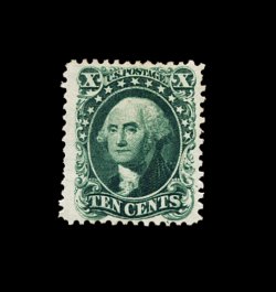 111 og 43 image#43, 10c Blue green reprint, without gum as issued, magnificently centered and margined for this difficult value, as most are found with rather poor centering and tight margins, with this particular example having such wide margins that no portion of the design is impinged by its perforations, additionally this stamp features spectacularly intense color and a prooflike impression on bright crisp paper, extremely fine; among the finest of the 516 issued of this most challenging reprint; ex-Souren and Chapin. (Image) 3,250.00