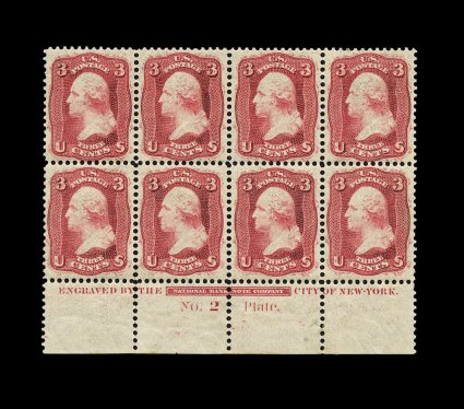 119 ogPB 56 image#56, 3c Brown rose "August", a showpiece full bottom margin imprint and plate "No. 2" block of eight, incredibly fresh and crisp, each stamp within the plate is extraordinarily well centered, especially when one considers how poorly centered these stamps can come, sumptuously rich color and a prooflike impression, full pristine o.g., lightly hinged, some separation of vertical perforations between the bottom three stamps, overall extremely fine; an enormously rare plate block, with this being the finest of only six such plate blocks recorded in the Chapin census; even the magnificent Dr. J. Paul Wampler collection did not contain an example of this plate block; 1971 PF certificate; ex-Chapin. (Image) 15,000.00