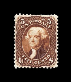 120 og 57 image#57, 5c Brown "August", an incredibly fresh original gum example of this important rarity, possessing a remarkable overall brilliance very few of the other existing examples can boast, with sumptuously rich and intense color, plus its impression could not be more deeply etched on bright crisp paper, extraordinarily well centered, nearly full o.g., there are some nibbed or shorter perforations which is a prevalent characteristic to most known copies, nevertheless this is a very fine and choice example; only 35 examples of the Five Cent "August" issue are known (two of which are cancelled) and only 16 of the existing population still retain any portion of their original gum; none of the existing original gum examples are completely fault free, with this particular copy being among the best of this elite group; 1971 PF and 1993 PSE certificates; ex-Carey, Chanin, Sheriff and Weisman. (Image) 15,000.00
