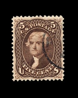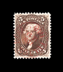 165 O 76 image#76, 5c Brown, an absolutely gorgeous used single, well centered within large margins, truly prooflike color and impression on bright fresh paper, superbly cancelled by a very scarce and unusual red "Fulton Bank/Jun 29, 1862" revenue cancel, extremely fine; a stamp with tremendous eye appeal; 2002 PF certificate. (Image) 135.00