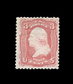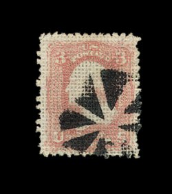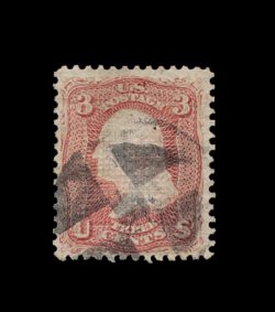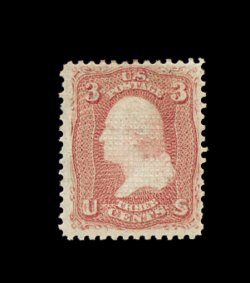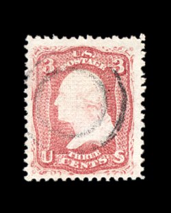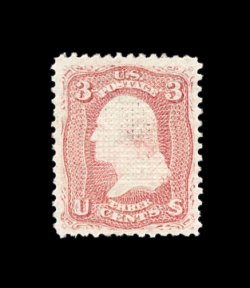 168 O 79 image#79, 3c Rose, "A" grill, used, particularly well centered within large margins, much stronger color than usual, neat circle of "V's" postmark, without any of the flaws that are so endemic to this notoriously difficult all-over grill, very fine; a true rarity in this choice fault-free condition; 1977 PF certificate; ex-Wyer and Chapin. (Image) 1,350.00