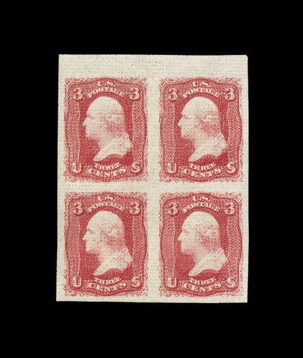 169 ogbl 79a image#79a, 3c Rose, "A" grill, imperforate, a superb top sheet-margin block of four of this rare and seldom offered imperforate, huge margins all around, brilliantly fresh, gorgeous intense color and impression, full clean o.g., lightly hinged, extremely fine gem; a showpiece grilled multiple; 1975 PF certificate; ex-Chapin. (Image) 4,000.00