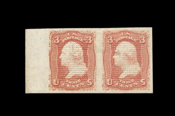 172 og 83a image#83a, 3c Rose, "C" Grill, imperforate, left sheet-margin horizontal pair, wonderfully large margins all around, rich color, full o.g., crisp grill impressions, extremely fine; an especially choice pair of this rare imperforate variety; 1971 PF certificate; ex-Chapin. (Image) 1,850.00