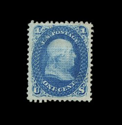 178 og 86 image#86, 1c Blue, "E" grill, incredibly handsome mint example, featuring unusually large margins all around and being exceptionally well centered within them, prooflike color and impression, full clean o.g., mild natural diagonal pre-printing paper wrinkle/crease at bottom left, otherwise extremely fine for this scarce mint stamp; ex-Chapin. (Image) 3,000.00
