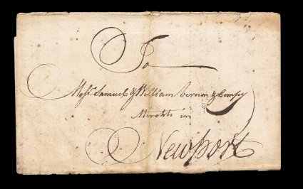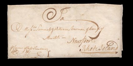 1 c image1773 Folded letter from Tortola, a very clean and attractive double letter-sheet from a Peter Smith, datelined "Tortola, March 5th 1773", carried "per favor of Capt. Freeborn/Q.D.C." (Whom God Preserve), who recently had arrived from St. Eustatius (a small island northwest of St. Kitts), to Colonial America and addressed to "Messrs. Samuel and William Vernon & Compy./Merchants in Newport, Rhode Island", very fine and rare; at this early date letters were hand carried by whomever was going to the desired destination, usually a ship captain; this is the second earliest known letter from the Virgin Islands of three letters of this period in private hands, all from the Vernon correspondence. (Image) Est. 750-1,000