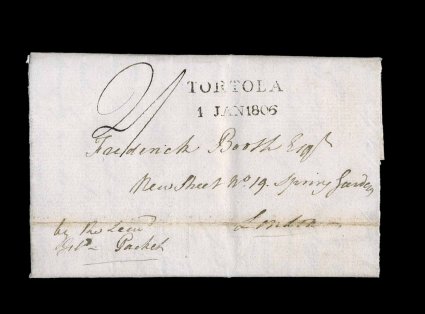 10 c image"Tortola/1 Jan 1806" straight line datestamp, Type 3A, an excellent strike on front of folded letter from Antigua, strangely datelined "Antigua, 30 Decbr. 1804", a year early (this is probably in error and should be 1805 as the writer first speaks of the ending of hostilities between the British and the French and the "loss of Dear Nelson", referring to Admiral Horatio Nelson, who was killed in the battle of Trafalgar in October 1805), carried to Tortola for the packet to England and endorsed "by the Leewd Isld Packet", rated "2/-" and backstamped London on February 7th, a fresh and very fine early letter showing the use of Tortola as the departure point for mail from the Leeward Islands. (Image) Est. 750-1,000