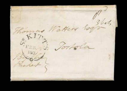 11 c image1807 Inbound interisland folded letter, attractive letter written at Antigua on February 23, 1807 and endorsed "By the Packet", receiving a lovely strike of the scarce "St. Kitts/Feb 28, 1807" large fleuron c.d.s., manuscript "Tortola Received March 6th 1807" on the reverse, rated "3 bits", double rate letter "8d", minor stain at top, otherwise very fine; an exceptionally scarce cover as very little inbound mail of this period has survived. (Image) Est. 500-750