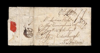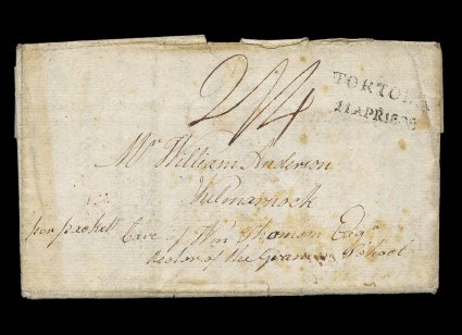 12 c image"Tortola/11 Apr 1808" straight line datestamp, Type 3A, quite clear strike on front of folded letter from British occupied St. Croix, datelined "St. Croix, 16 January 1808" and carried to Tortola for passage to Scotland by the monthly packet, rated "2/4" for 1/1 packet rate to England plus 1/3 inland rate to Scotland, London transit on reverse, edgewear and light soiling but very fine for the period and usage; this is one of two letters known from this British occupation period, since this is very shortly after the occupation began, in his letter to his sons he relates the events of the occupation and notes that he is responsible for some of the provisions of the occupying forces (particularly drink), he also is concerned about what his children write in letters as the mail is censored, a rare and desirable letter reflecting important historical events. (Image) Est. 1,000-1,500