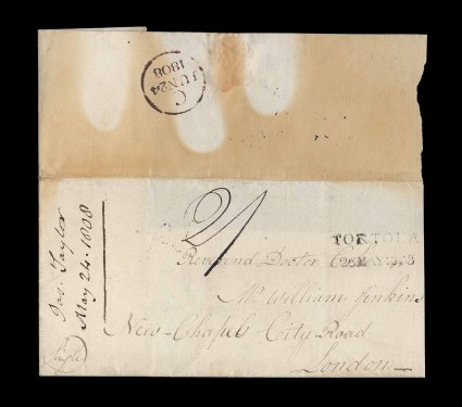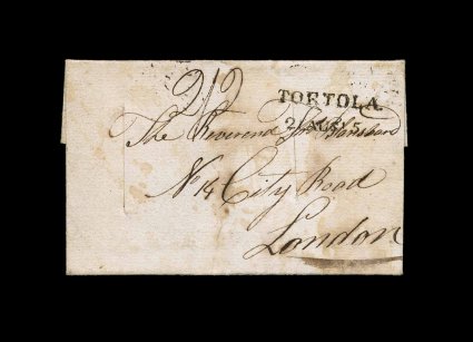 13 c image"Tortola/26 May 1808" straight line datestamp, Type 3A, clear strike on folded disinfected cover (right flap missing) to London, this cover shows the typical monthly packet passage with ms. "2/-" rate that would have come through Falmouth to London, this makes the disinfection all that more unusual as the mail packet would not have been a ship normally subject to quarantine and disinfection, very fine and attractive cover; not a great deal is known about disinfection in England, but it was normal for the mail through Falmouth to be disinfected at the St. Just Pool station, this cover shows scorching on the reverse with a distinct silhouette of the tongs used to hold it over the fire where disinfection substances, such as sulfur, were burned, this is a much less common form of disinfection as sprinkling with vinegar which was the usual method, a very rare disinfected cover from the Caribbean as most disinfected mail originated in Europe or the Mediterranean. (Image) Est. 3,000-4,000