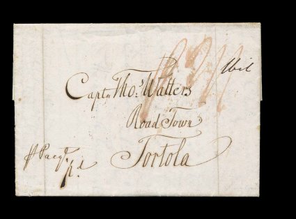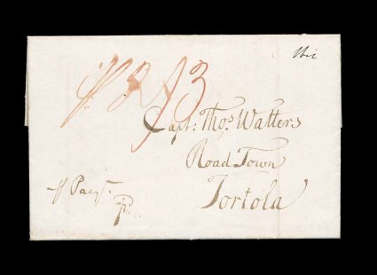 16 c image1812 Inbound folded letter, exceptionally fresh letter sent by Falmouth packet to Road Town, Tortola, light Liverpool mileage c.d.s. on the reverse, endorsed "p Paqt. Pd." for prepaid service, manuscript "P 2/3" reflecting the rate change of July 1812 for this service, plus "1 bit" due for local assessment, manuscript "Recd. Tortola Feby 24th 1813", extremely fine and a lovely example of this packet service to the Virgin Islands. (Image) Est. 200-300