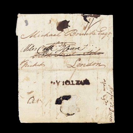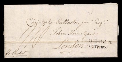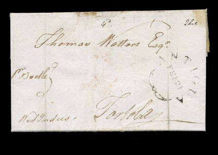 6 c image"Tortola/Oct 7 1800" straight line datestamp, Type 3C, well struck example with date changed by hand from the 7th to the 23rd, applied in transit to front of folded merchant's letter datelined "St. Kitts, Octbr. 17th, 1800", sent "Per Packet" to London, rated "1/8" and backstamped on November 26th, portion of backflap missing in opening and marking is over a normal file fold, otherwise very fine; this is a scarce type of marking with larger "Tortola" than is usually seen, in this early period it is very rare being only recorded in the months of September and October of 1800 (a similar, but not identical, marking was used in 1839-48, also scarce), this is the only example in the McCann collection and there was no example in the J.L. Fredrick collection. (Image) Est. 1,000-1,500