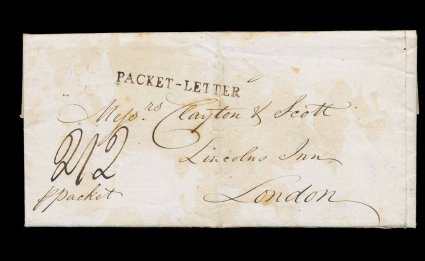17 c image1815 "Packet-Letter" straight line handstamp, a wonderfully clear strike of this unusual marking, applied to the front of folded letter, backstamped London and datelined "Tortola 13th July 1815", manuscript "p packet" at bottom left indicates this letter was intended to go by the the normal Falmouth monthly packet, but not receiving the normal Tortola date marking that was usually applied to such letters, this packet marking, apparently applied at London, was put on to indicate what type of mail this was and how it should be rated, usual "2/2" manuscript designation, very minor staining to cover, which otherwise is quite fresh and very fine; a rare usage that is clearly out of the ordinary for transatlantic covers of this period. (Image) Est. 500-750