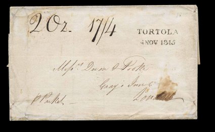 19 c image"Tortola/4 Nov 1815" straight line datestamp, Type 3A, a clear and well struck example of a decidedly scarce multiple rate cover for a heavy enclosure, posted to London with manuscript "p Packet" endorsement, believed to have originated in St. Kitts but no contemporaneous notations to confirm this, rate marked in manuscript "2 Oz. 17/4", backstamped London on December 18th, very minor edge wrinkles which is entirely normal for such a large missive, very fine; this high rate represents an eight times rate of the 1sh/2p packet fee plus eight times the 1/- inland rate from Falmouth to London, such highly rated covers are extremely scarce as this is just slightly less than £1, a very substantial sum at this time. (Image) Est. 1,000-1,500
