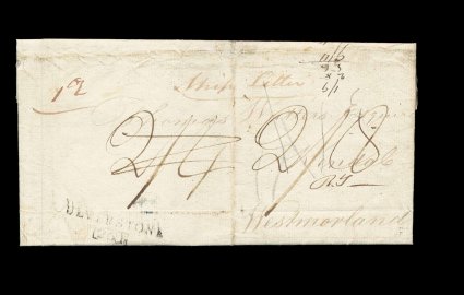 20 c image1816 Ulverstone ship letter from Tortola, this folded letter with enclosure is from the well-known correspondence to Thomas Watters at Kendal, Westmoreland in England, usually his letters were sent by packet via Falmouth in the south of England, but this was sent by private ship which made port at the rarely used, but closer, port of Ulverstone in the north of England, this port had no ship-letter handstamp so it was written in red and the "Ulverstone/261" mileage handstamp was applied at bottom left, manuscript "1 Oz" because of heavy enclosure, "2/4" rate crossed out, and re-rated "2/8" and initialed "R.T." by Robert Town, the postmaster, the packet rate would have been 2/4 times four or 9/4, which may explain the use of a private ship rather than the packet service, normal folds and wear for a letter of this size, otherwise very fine; an interesting addition is that this was a letter requesting insurance on the writer's ship, "Harriet", which unknown to the writer, had foundered two days previously in route to the United States, this is the only known ship letter of this port, and especially interesting being from the Virgin Islands. (Image) Est. 500-750