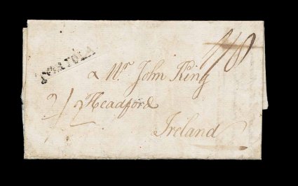 5 c image1798 "Tortola" straight line handstamp, Type 2, on front of folded letter to Ireland, originally rated "1/8", which would have been correct to London, but re-rated "2/2" to include the additional inland 6p to Ireland, datelined "Decem. 23rd, 1798", long personal family letter that relates the interesting postal fact that the packet that served Tortola left England on the first Monday of the month, cover is fresh and attractive, very fine; a very scarce marking of which only five examples are known. (Image) Est. 2,000-3,000