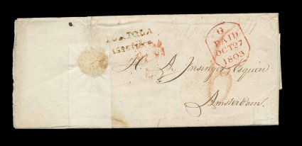 7 c image"Tortola/19 Sep 1802" straight line datestamp, Type 3A, a well struck example applied in transit on front of folded merchant's letter to Amsterdam, Netherlands, datelined "St. Thomas, 18 July 1803", and rated "Post paid 5/11" in light manuscript for a double-rate letter per British packet, red London "Paid" date stamp on the front and Foreign Office transit on the reverse, docketing indicated it was not received until November 18th, clean and attractive though left flap of letter was separated and re-attached with wax seals for filing by the recipient, otherwise very fine; a very rare letter illustrating the great length of time required for correspondence during this period; this is the earliest known cover through the Virgin Islands to a foreign country other than the United States. (Image) Est. 1,000-1,500