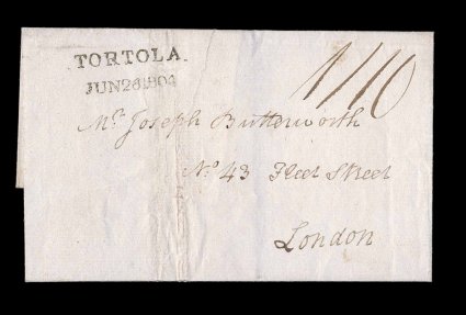 8 c image"Tortola/Jun 26 1804" straight line datestamp, Type 3A, an unusually well struck example of this early marking, on front of folded cover to London, rated "1/10" per packet and the new 1801 inland rate of 10p to London, mended tear to cover not affecting the marking, very fine appearance; while this marking is the more common size listed under the broad category of Type 3A, it is the very scarce early variety with month before day (day usually comes before month), it is only recorded between 1801-04 and this is the only example in the McCann collection, there also was no example in the Fredrick collection. (Image) Est. 500-750