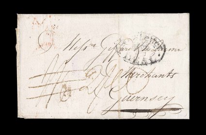 9 c image1805 Ship letter, folded cover sent on October 12th per docketing, which places the sender, Robert Longhurst, with Captain Hegenbottom in Tortola, to the British island of Guernsey, "Ship Letter/Deal" double oval handstamp, London transit of February 1806, double rate letter re-rated "2/-" from "1/6" as the inland rate from London to Guernsey had increased from 4p to 7p in 1805, very fine; nice usage of a private ship rather than the usual mail packet to a scarcer destination. (Image) Est. 500-750