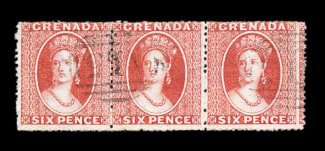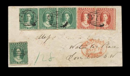 181 c S.G. #4, 9 imageS.G. #4, 9, 1864-71 1p Green and 6p Vermilion, both perf. 14 to 16, wmk. small star, horizontal strip of three of the 1p Green in an unusually thick paper variety, and horizontal pair of the 6p Vermilion in a deep shade, both on front of petite 1872 registered cover to London, central "A15" in bars oval cancels, while not tying the stamps, the cancels are impressed strongly enough to impress the envelope (apparently there was a stamp removed at bottom left and another stamp that does not belong has been hinged in place), on the front is also a light but quite clear strike of the rare red "Registered" straight line handstamp, "Grenada/FE 08 72" c.d.s. with index letter "A" on the reverse, London receiving handstamps on front and back, name in the address has been eradicated scuffing the cover, otherwise very fine appearance and rare usage; only three covers are known with this registry handstamp (Scott #3, 5). (Image) Est. 750-1,000