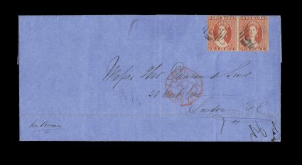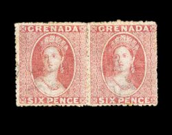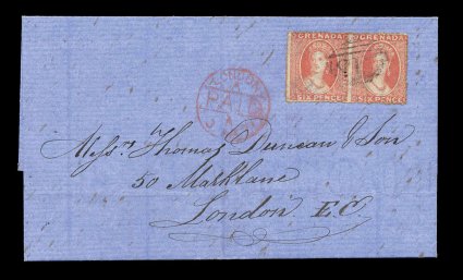 188 c S.G. #8 imageS.G. #8, 1863 6p Dull rose red, rough perf. 14 to 16, wmk. sideways small star, horizontal pair showing the delicate nuances of this scarce shade, centered a bit into the design at right with slight gum stains on the perfs., on 1871 folded cover to London, not tied but clearly proper to the cover, red London "Paid receiving c.d.s. on the front and light "Grenada/MR 10 71" small c.d.s. with index letter "A" on the reverse across the letterjoin; attractive and very fine cover; pairs of the 6p are the most common usage being the rate to Britain, however this particular issue is exceptionally scarce on cover and very few examples are found in the major collections of Grenada. (Image) Est. 1,500-2,000