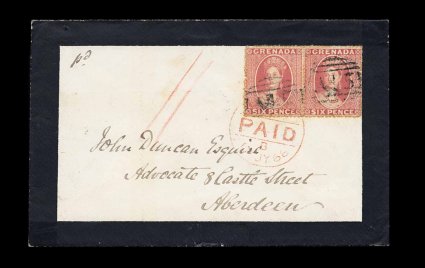 183 c S.G. #6 imageS.G. #6, 1863 6p Rose, rough perf. 14 to 16, wmk small star, an incredibly well centered horizontal pair with strong rose color, on pristine 1868 mourning cover paying the packet rate to Britain, with "A15" in bars oval cancels and tied by red London "Paid" c.d.s., on the reverse is clear "Grenada/JU 25 68" small c.d.s. with index letter "A" and backstamped "Aberdeen, Scotland", extremely fine cover and usage; covers of such high quality are rarely found from this early stamp period of Grenada; ex-Messenger and Hackmey (Scott #4). (Image) Est. 1,000-1,500