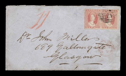 184 c S.G. #6 imageS.G. #6, 1863 6p Rose, rough perf. 14 to 16, wmk. small star, attractive and quite well centered horizontal pair, just tied to 1864 cover to Glasgow by single strike of "A15" in bars oval cancel, small "Grenada/AU 23 64" c.d.s. with index letter "A" on the reverse, red London transit, backstamped Glasgow, light cover soiling and small edge tear to cover at left, otherwise very fine; the transatlantic rate to Britain was raised from 6p to 1/- in April of 1863, since no 1/- stamps were issued by Grenada until 1875 pairs of the 6p were used to fill the void; a nice example of this usage. (Image) Est. 750-1,000