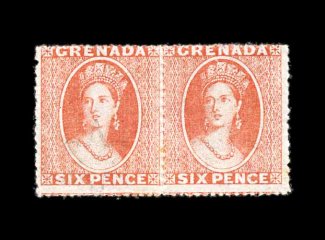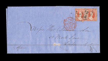 185 c S.G. #7 imageS.G. #7, 1866 6p Orange red, rough perf. 14 to 16, a fabulously well centered horizontal pair of an issue that virtually never comes centered because of its exceptionally close spacing on the plate, bright strong color, neatly tied to folded cover to London by "A15" in bars oval cancel, "Grenada/NO 08 71" small c.d.s. with index letter "A", red London Paid receiving c.d.s. on the front, a fresh and attractive cover showing the transatlantic 1/- packet rate, extremely fine; signed Holcombe; ex-Messenger and Hackmey (Scott #4 var.). (Image) Est. 750-1,000