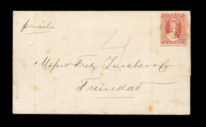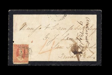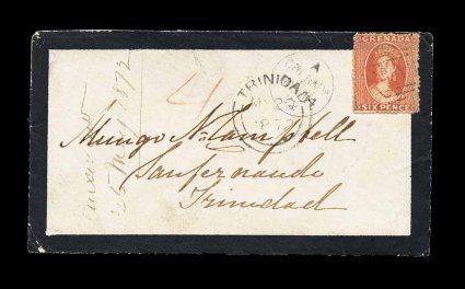 191 c S.G. #9 imageS.G. #9, 1871 6p Vermilion, rough perf. 14 to 16, wmk. small star, unusually well centered single on 1872 mourning cover to Trinidad with light "A15" in bars oval cancel, small "Grenada/MY 14 72" c.d.s. with index letter "A" at left, slightly overstruck by the Trinidad double-arc receiving c.d.s., small piece missing from backflap, otherwise very fine and attractive cover with all markings on the front (Scott #5). (Image) Est. 500-750