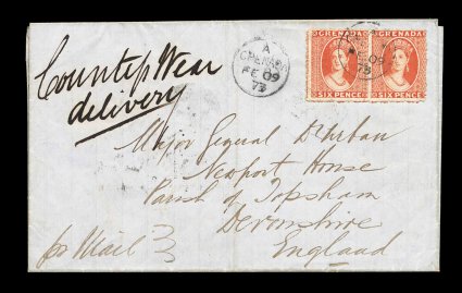 194 c S.G. #9 imageS.G. #9, 1871 6p Vermilion, rough perf. 14 to 16, wmk. small star, an especially pretty horizontal pair despite being centered into the design at right, with bright radiant vermilion color, neatly tied to 1873 folded cover to England by small "Grenada/FE 09 73" c.d.s. with index letter "A", additional strike at left, backstamped Topsham in Devonshire with several British transits, very fine transatlantic packet usage; ex-Messenger and Hackmey (Scott #5). (Image) Est. 750-1,000