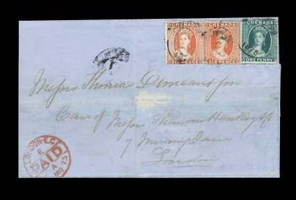 196 c S.G. #9, 10 imageS.G. #9, 10, 1873 6p Vermilion, rough perf. 14 to 16, wmk small star, horizontal pair along with 1p Green single with clean cut perf. 15, tied to 1875 folded cover to London by indistinct "D/Jan 28/1875" c.d.s. of Grenville, small Grenada transit on the reverse and red London Paid receiving c.d.s. on the front, accompanying 2002 BPA certificate states extensively restored which we think is unduly harsh as it consists largely of the reinforcement of a horizontal file fold that is well clear of the stamps and markings as described in the Russell Jones sale, and perhaps a mild cleaning of the front of the cover, very fine appearance; this franking is rare with only three examples recorded, all from the same correspondence in having an additional 1p franking over the 1/- packet rate to pay inland postage from on outlying post office to St. George's, mail originating at St. Georges only needed the 1/-; 2002 BPA certificate; ex-Towers (Scott #5, 5B). (Image) Est. 1,500-2,000
