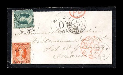 198 c S.G. #11, 12 imageS.G. #11, 12, 1873-74 1p Blue green and 6p Orange vermilion, both intermediate perf. 15, wmk. large star, 1p with sideways wmk. and rounded corner perf., tied to lovely and rare mourning cover to France by clear "D/May 10 1874" c.d.s. of Grenville, small Grenada and red London Paid transits on the front and several French transits and backstamps on the reverse, very fine and attractive; a most unusual franking which appears to have been accepted underfranked, the Grenada post office seems to have had difficulty knowing how to frank covers to France, prior to the packet rate change in 1863 covers to France were charged 8p, after that we have three covers each from the General Post Office and the parish post offices with the use of bisects rated between 8p and 1/1 1/2, this one is rated much like a parish post office postings to one of the other West Indies islands, regardless there is no evidence from cancels or otherwise that stamps are missing making this an extremely rare as well as a beautiful cover; ex-Messenger and Hackmey, featured in these sales as a lovely cover with no mention of the rate discrepancy (Scott #6, 7). (Image) Est. 1,000-1,500