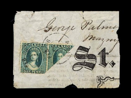 199 O S.G. #11b imageS.G. #11b, 1874 1p Blue green, intermediate perf. 15, wmk. sideways large star, diagonal bisect in pair with single, on piece of St. George's Chronicle and Grenada Gazette, tied by "D/Feb 26/1874" c.d.s. of Grenville, stamps are well centered and bisect is very well tied, small edge tears to piece, fine and scarce; this piece illustrates the legitimate authorized bisecting to meet the 1 1/2p newspaper rate to Great Britain that resulted when the paper was posted from an outlying parish post office (1/2p from Grenville to St. George's plus 1p transatlantic newspaper rate to Britain), bisecting was necessary because there were no 1/2p stamps issued until 1881, this particular issue is listed but unpriced, similar priced issues of the period are all valued at over £6,000 on cover in Stanley Gibbons (Scott #6; $7,500.00 on cover). (Image) Est. 750-1,000