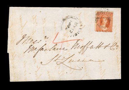 200 c S.G. #12 imageS.G. #12, 1873 6p Orange vermilion, intermediate perf. 15, wmk. large star, single centered to the bottom right, tied to folded cover to St. Lucia by indistinct "A15" in bars oval cancel, three strikes of "Grenada/MY 09 76" small c.d.s. with index letter "A" on the reverse, small double-arc St. Lucia receiving c.d.s. on the front, a very fine cover and scarce, as unlike other Caribbean islands, very little mail was sent to St. Lucia; ex-Messenger and Hackmey (Scott #7). (Image) Est. 750-1,000