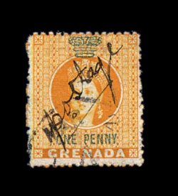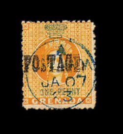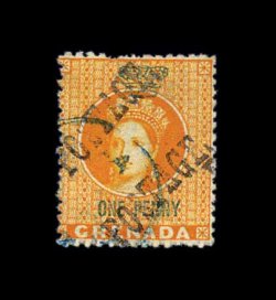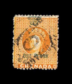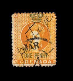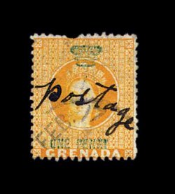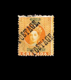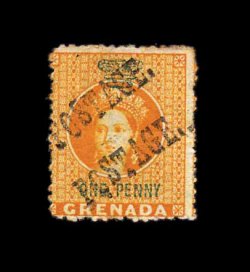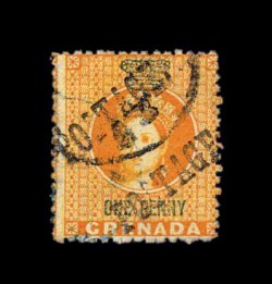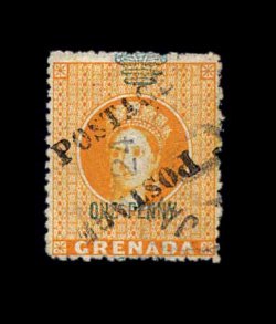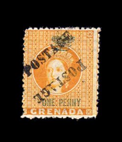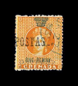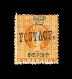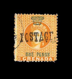 280 O image1883 1p Orange revenue with Gouyave diagonal manuscript provisional "postage" overprint, type with lower case "p" in "postage", attractive used example with clear overprint and identifiable "A" cancel of Gouyave dated March 1st, fresh with normal fine centering (Scott #19; $2,250.00). (Image) £2,250