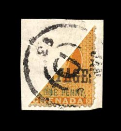 265 O S.G. #27d imageS.G. #27d, 1883 1p Orange revenue with provisional "Postage" overprint, diagonal bisect, used on piece as 1/2p and beautifully tied by exceptional strike of "D/Jan. 5 83" double circle c.d.s. of the parish post office of Grenville, extremely fine usage; this is an extremely early usage in a parish post office as this stamp was not issued until January of 1883; Stanley Gibbons for a bisect on cover is priced at £3,000 (Scott #16d; $3,250.00 on cover). (Image) Est. 400-500