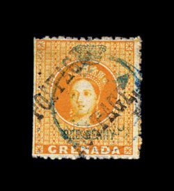 279 O image1883 1p Orange revenue with Gouyave diagonal manuscript provisional "postage" overprint, the type with lower case "p" in "postage", an exceptionally attractive used example with light "A" cancel of Gouyave dated March 2nd, centering is just barely into design at top, better than most, which almost always cut the design on two sides, and the best centered of the examples in the Walker collection, very fine for this; 1996 BPA certificate (Scott #19; $2,250.00). (Image) £2,250