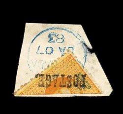 264 O S.G. #27c imageS.G. #27c, 1883 1p Orange revenue with Provisional "Postage." overprint, with inverted "S", lightly cancelled used example of this variety, clear overprint showing the inverted "S", stamp has brilliant color, fresh and fine centering (Scott #16c; $525.00). (Image) £600
