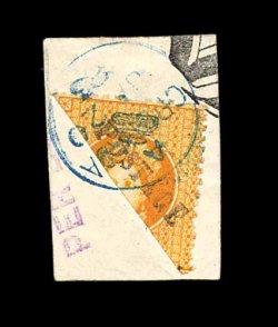 275 O S.G. #29 var. imageS.G. #29 var., 1883 Half of 1p Orange revenue with provisional "Postage" overprint, overprint reading northwest to southeast, top right diagonal bisect very neatly tied to small piece of newspaper paying the internal 1/2p rate, tied by blue "Grenada/JA 20 83" c.d.s., overprint is clear and distinct, very fine; a most unusual variety as this handstamp applied both "Postage" overprints tete-beche to each stamp in one operation, but normally oriented so the top left half of the stamp was used rather than the top right, this variety occurs by rotating the handstamp 45 degrees, in essence equivalent to an inverted overprint, unlisted in the catalogs; this is the discovery copy of this variety and the only one that we are aware of, nicely used in a commercial manner; 1977 RPS certificate (Scott #15 var.). (Image) Est. 500-750
