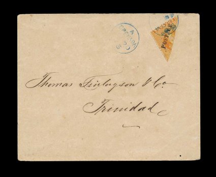 276 c S.G. #29 imageS.G. #29, 1883 half of 1p Orange revenue with provisional "Postage" overprint, neatly tied to unsealed envelope to Thomas Finlagson & Co. in Trinidad by small blue "Grenada/JA 20 83" c.d.s. with index letter "A", trivial pinhole at bottom right and slight overall aging to the paper of the envelope, otherwise very fine; this contained prices current and the 1/2p franking paid the interisland printed matter rate, which all went to Britain for sea passage, in February Grenada began to charge postage due to such usages, which were often philatelic, to recover the fee for its postal services even though this was against UPU regulations; scarce early usage (Scott #16). (Image) Est. 200-300