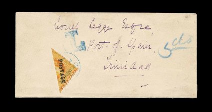 277 c S.G. #29 imageS.G. #29, 1883 half of 1p Orange revenue with provisional "Postage" overprint, attractive bisect tied to small cover to Trinidad by small February Grenada c.d.s. in blue, matching blue "T" postage due handstamp with "5 cts" marked in blue crayon, very fine cover paying the printed matter rate; Grenada marked it due in an attempt to recover their postal fee despite the fact this was against UPU regulations (Scott #16). (Image) Est. 200-300