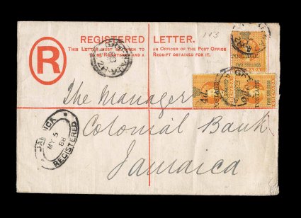321 c S.G. #41 imageS.G. #41, 1888 "4d/Postage" provisional surcharge, 4mm spacing, on 2/- Orange revenue, a pair and single tied to 2p Gray registry envelope (H&G #C1a; 152x96mm) to the Colonial Bank in Jamaica by "Grenada/AP 28/88" c.d.s. with additional strike at left, double oval registry receiving handstamp on the front, stamps with usual fine centering and minor wrinkles to cover, still a very fine commercial triple rate usage; clear 1975 BPA certificate (Scott #32). (Image) Est. 500-750
