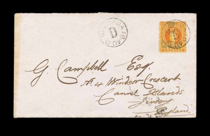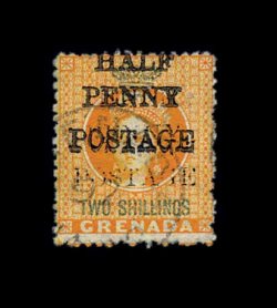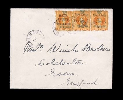 326 c S.G. #43, 45 imageS.G. #43, 45, 1889 "Half/Penny/Postage" and "Postage/and/Revenue/1d." provisional surcharges on 2/- Orange revenues, two singles of the latter, all three with typical centering of the basic revenue stamps, tied to cover to England by "Grenada/JA 15/91" c.d.s., backstamped Colchester, very fine; the British Imperial rate of 2 1/2p to any participating British Colony had just gone into effect on January 1st of 1891, we know the General Post Office was short of the 1p value and may well have been short of the 1/2p value as well as De La Rue made a shipment of this value on January 20th 1891, an attractive usage of two provisional issues (Scott #31, 35). (Image) Est. 750-1,000