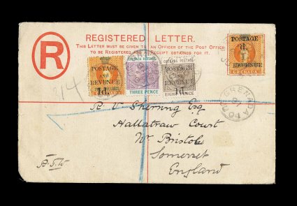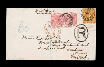 323 c S.G. #40, 42 imageS.G. #42, 1888 "4d/Postage" provisional surcharge, 5mm spacing, on 2/- Orange revenue, tied to registered envelope to England by scarce "Grenada/A/ 15 SP 88" c.d.s. of the parish post office at Gouyave, similar strike on the reverse, additional 1p Carmine right sheet-margin pair (S.G. #40) tied by a Grenada c.d.s. of the General Post Office at St. George's as well as the "R" in oval and red London registry oval, it is not clear where the 1p stamps and registry marking were applied, but the most logical explanation is that the stamps were applied at Gouyave and not cancelled, so cancelled in transit, backstamped, backflap torn in opening with a couple of minute tears carrying over to the front, otherwise a scarce and intriguing cover; ex-Messenger and Hackmey (Scott #30, 32a). (Image) Est. 500-750